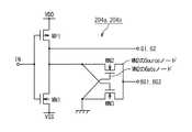 図3は、従来技術による出力回路204a、204bの構成を概略的に示す回路図である。図3の出力回路204a、204bは、入力部INと、インバータ回路部と、Nラッチ回路部と、第1または第2のゲート側端子G1、G2と、第1または第2のバックゲート側端子BG1、BG2とを具備している。インバータ回路部は、P型MOSトランジスタMP1と、N型MOSトランジスタMN1とを具備している。Nラッチ回路部は、N型MOSトランジスタMN2、MN3を具備している。  FIG. 3 is a circuit diagram schematically showing the configuration of