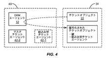 従って、少なくとも一実施形態において、チケットオブジェクト22は、共にコンテンツ暗号鍵28により保護された組込み型チケットエージェント42−1及びチケット鍵26を含む複合チケットオブジェクトを備える。更に1つ以上の処理回路40は、DRMエージェント12から組込み型チケットエージェント42−1及びチケット鍵26を検索し、且つチケットオブジェクト22を引き換えるために組込み型チケットエージェント42−1を使用することにより、チケットオブジェクト22を引き換えるように構成される。少なくともそのような一実施形態において、1つ以上の処理回路40は、図4に示すようにマスタチケットエージェントを実現するように構成される。本明細書において、マスタチケットエージェント42−2は、DRMエージェント12から組込み型チケットエージェント42−1及びチケット鍵26を取り出すように構成される。すなわち、マスタチケットエージェント42−2は、権利オブジェクト30により課された使用制限に従って、DRMエージェント12による安全なチケットオブジェクト22の復号化/解凍を開始するように構成される。  Accordingly, in at least one embodiment,
