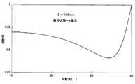 図9には、ポリゴンミラー19に入射する光がp偏光の場合について、該入射光の入射角と偏向反射面での反射率との関係が示されている。これによると、入射光がp偏光の場合には、入射角が大きくなるにつれて反射率が低下する傾向にある。  FIG. 9 shows the relationship between the incident angle of the incident light and the reflectance at the deflecting reflection surface when the light incident on the