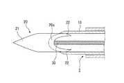図3は、生検具1の先端部の断面図である。先端チップ20は、先端側に略円錐状の鋭利な穿刺部21を有する。先端チップ20の基端側は内腔を有する略円筒状に形成されている。先端チップ20の外径は針管10の内径よりも小さいため、図3に示すように、先端チップ20は針管10内に進入可能である。  FIG. 3 is a cross-sectional view of the distal end portion of the