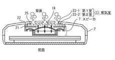 また、本実施形態では、第1筐体2にリブ22が設けられている場合について説明した(図2参照)。但し、前気室23の水が内部空間19側に漏洩しないように、スピーカ7が第1筐体2に支持されていれば、リブ22は必ずしも設けられている必要はない。例えば、スピーカ7と第1筐体2の内壁とを、両面テープやクッションを介して密着させることにより、前気室23が形成されてもよい。  Moreover, in this embodiment, the case where the