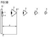 図5A及び図5Bに示されている実施例では、対象5の検出が、画像識別装置を用いて行われている。それに対して画像センサ4は、対象5の画像を検出するように構成されている。従ってここでの画像識別装置は、対象を識別すべく画像を評価できるように構成されている。ここでは画像中の対象5の大きさを介して、光源1と対象5との間の間隔xが推定されている。  In the embodiment shown in FIGS. 5A and 5B, the detection of the