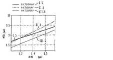 話を簡単にするために、親出願から得られた以下の説明では、図1A〜図1BのタイプIのRAF10の設計を中心に論じる。ただし、類似の考察が図1C、図1D、および図3のタイプIIのRAFの実施形態に当てはまることは当業者には明らかであろう。ファイバ10のAeffは主に2つのパラメータによって制御される。1つは、コア領域12.1と内側トレンチ領域14.2の間の屈折率差Δn、すなわちΔn=(ncore−ntri)であり、もう1つは、コア領域12の径方向の幅またはコア面積、すなわち円形の断面の場合はコア領域の直径Dであるが、非円形の断面の場合はコア面積である。より具体的には、所与のDの場合、屈折率差が減少すると、基本モード・フィールドの閉じ込めが減少するが、これはそのAeffが増加することを意味する。ただし、モード閉じ込めが減少することは、特にファイバが鋭く曲げられたとき(たとえば、曲げ半径が2〜15mm)、ファイバがより不良な導波路として作用し、光損失が増加することを意味する。一方、所与のΔnについて、コア領域12の直径が増加すると、Aeffが(直径の2乗と同じくらい)増加するが、サポートされるHOMの数も増加する。一般に、HOMにかなりのエネルギーが存在することは望ましくないことがある。たとえば、ファイバがミクロ曲げをされた場合、光損失が増加する。For simplicity, the following description from the parent application will focus on the design of the