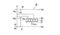 画素40において、第1トランジスタTR1のゲートに第1走査線66が接続され、ソースにはデータ線68が接続され、ドレインには第1電極35aが接続されている。第2トランジスタTR2のゲートに第2走査線67が接続され、ソースに第1トランジスタTR1と共通のデータ線68が接続され、ドレインには第2電極35bが接続されている。  In the