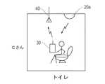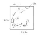 また、位置情報発信機20は、病室、トイレ、談話室などの比較的広い範囲をカバーするエリアモード、または、出入口、廊下など比較的狭い範囲をカバーするゲートモードに設定(切り換え)可能である。図中では、エリアモードに設定された位置情報発信機に参照番号20aを付し、ゲートモードに設定された位置情報発信機に参照番号20bを付している。  Further, the position information transmitter 20 can be set (switched) to an area mode that covers a relatively wide area such as a hospital room, a toilet, and a common room, or a gate mode that covers a relatively narrow area such as an entrance and a corridor. . In the figure, the