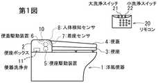 洋風便器1の後部上面に便座ボックス2が設置されている。この便座ボックス2に便座3及び便蓋4が起倒方向回動可能に取り付けられている。便座ボックス2内には、この便座3の起倒駆動用の便座駆動装置5と便蓋4の起倒駆動用の便蓋駆動装置6とが設けられている。これらの駆動装置5,6はモータ及びギヤよりなる。便座ボックス2には便座3への着座を検知する着座センサ7と、洋風便器1に近づいた人体を検知する人体検知センサ8とが設けられている。便座ボックス2内には、この駆動装置5,6の駆動を制御するための制御ユニット(図示略)が設けられている。便座ボックス2内又は洋風便器1の後部には、便器洗浄弁11と、この便器洗浄弁11の制御装置12(第2図)が設けられている。便座ボックス2には、後述のリモコン20からの赤外線信号光を受信するための信号光受信器10が設けられている。  A