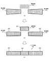 第1のデータ読出方法は、撮像素子134について1ラインのデータを読出す場合において、その1ラインの方向を撮像素子134に対応する長方形の領域の短辺方向とする方法である。第1のデータ読出方法では、撮像素子135および136について1ラインのデータを読出す場合には、その1ラインの方向を撮像素子135および136に対応する長方形の領域の長辺方向とする。この例を図6(a)に示す。第1のデータ読出方法では、3個の撮像素子134乃至136から読み出された画像データを読み出された順番で画像メモリ170に書き込むことができる。また、このデータを読み出して画像信号処理を行う場合でも、同じ順番で読み出すことができるため、メモリへのデータの書き込みおよび読出しを容易に行うことができる。ただし、一般に、撮像素子は読出しライン方向が長辺方向であるため、読出しライン方向が短辺方向の撮像素子を新たに用意する必要がある。  The first data reading method is a method in which when one line of data is read from the