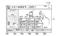 又、初期設定画面71に表示されない設定項目(例えば、枠消しの設定項目や余白の設定項目や読取解像度の設定項目や原稿種類の設定項目など多数)を設定するには、簡単設定タブTB1に並ぶ原稿/用紙/仕上げタブTB2や、カラー/画質タブTB3や、レイアウト編集タブTB4や、応用/その他タブTB5やプログラムタブTB6が表示されている位置をタッチする。それぞれの設定項目はいずれかのタブに予め関連づけられる。タブが表示された位置がタッチされると、パネル制御部10はタッチにより指定されたタブに関連づけられた設定項目の設定キーを一覧的に表示した設定画面を表示部11に表示させる。  In addition, in order to set setting items that are not displayed on the initial setting screen 71 (for example, a frame setting item, a margin setting item, a reading resolution setting item, and a document type setting item), the simple setting tab TB1 is used. Touch the position where the lined original / paper / finishing tab TB2, color / image quality tab TB3, layout editing tab TB4, application / others tab TB5 and program tab TB6 are displayed. Each setting item is associated with one of the tabs in advance. When the position where the tab is displayed is touched, the