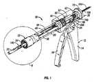 上記作動アセンブリは、本体部分に接続された少なくとも一つのハンドルを備え得る。上記近置アセンブリは、以下を備え得る:少なくとも一つのハンドルに螺合されたねじ切りされた棒部材;および、このねじ切りされた棒部材の近位端に作動可能に接続されたノブ部材。分配アセンブリは、このねじ切りされた棒部材の遠位端に作動可能に結合され得る。このねじ切りされた棒部材は、その対向する側面に形成される窓を備え得る。この窓は、少なくとも一つの排出ポートに位置合わせされ得る。 The actuation assembly may include at least one handle connected to the body portion. The proximal assembly may comprise: a threaded bar member threaded into at least one handle; and a knob member operably connected to a proximal end of the threaded bar member. A dispensing assembly may be operably coupled to the distal end of the threaded bar member. The threaded bar member may comprise a window formed on its opposite side. The window can be aligned with at least one discharge port.