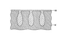 所定の回数ウエハWが回転すると、スペースSの側壁及び底部に堆積される酸化シリコン膜64の断面は、概ね、図8B(e)に示すようになる。すなわち、スペースSの底部側での膜厚は、スペースSの開口付近及びウエハWの表面における膜厚よりも厚くなり、スペースSの側壁において、僅かに凹状に湾曲している(凹状の湾曲の程度は、元のスペースSの側壁における凹状の湾曲の程度よりも軽減されている)。(Second step)
