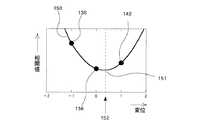 図8に示すパラボラフィッティング法においては、まず、最小値136、2番目に小さな値142および3番目に小さな値138の3点を通過する二次元関数が定義される。次に、当該二次元関数において対称軸の位置151が特定される。その位置151がサブピクセル推定値152とされる。もちろん、これらのサブピクセル推定法はそれぞれ例示であって、他の方法によりサブピクセル推定値を求めるようにしてもよい。  In the parabolic fitting method shown in FIG. 8, first, a two-dimensional function that passes through three points of a