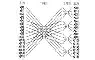 図1は、バタフライ演算器を用いた16点FFTの処理構成を示す図である。図1に示すように、16点FFTは、基数4のバタフライ演算が2段で実現できる。図2は、バタフライ演算器を用いた32点FFTの処理構成を示す図である。図2に示すように、32点FFTは、基数4のバタフライ演算が2段と、基数2のバタフライ演算が1段で実現できる。なお、図1、2においては、2本の線が交差した記号は基数2のバタフライ演算を表し、4本の線が○(白丸印)で交差する記号は基数4のバタフライ演算を表している。 FIG. 1 is a diagram showing a 16-point FFT processing configuration using a butterfly calculator. As shown in FIG. 1, the radix-4 butterfly operation can be realized in two stages in the 16-point FFT. FIG. 2 is a diagram showing a processing configuration of a 32-point FFT using a butterfly calculator. As shown in FIG. 2, the 32-point FFT can realize a radix-4 butterfly operation in two stages and a radix-2 butterfly operation in one stage. In FIGS. 1 and 2, a symbol in which two lines intersect represents a radix-2 butterfly operation, and a symbol in which four lines intersect with a circle (white circle) represents a radix-4 butterfly operation. .