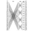例えば、図1に示した16点FFTにおいて、1段目の最初のバタフライ演算(1段目の1番上の○)の出力は、2段目の4つすべてのバタフライ演算の入力となる。また、2段目の最初のバタフライ演算の入力は、1段目の4つの全てのバタフライ演算の出力からなる。 For example, in the 16-point FFT shown in FIG. 1, the output of the first butterfly operation at the first stage (O on the first stage at the first stage) becomes the input of all four butterfly calculations at the second stage. The input of the first butterfly calculation in the second stage is made up of the outputs of all four butterfly calculations in the first stage.