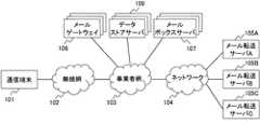 本実施の形態のメール転送システムは、事業者ネットワーク103内に構成されており、メールゲートウェイ106及びメールボックスサーバ107を備える。メールゲートウェイ106とメールボックスサーバ107とは、事業者ネットワーク103によって接続されている。  The mail transfer system according to the present embodiment is configured in the