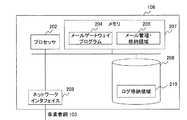 メールゲートウェイ106は、通信端末101から送信されたメールデータを受信し、受信したメールデータをメール転送サーバ105A等に転送するコンピュータである。メールゲートウェイ106の記憶装置208には、ログ格納領域210が設けられる。なお、第1の実施の形態のメールゲートウェイ106に設けられたメール格納領域209は、データストアサーバ108に設けられる。  The