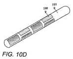 図11Dは、液状射出成形を使用してキャリア内にモールド成形することができる電極1100の1つの実施形態の概略斜視図である。この処理について、図11A〜図11Cを参照しながらより詳細に説明する。図11Aで分かるように、電極1100をキャリアモールド1120内に位置付けることにより、電極1100を所望のアレイ配列で設置することができる。いくつかの実施形態では、図11A〜図11Dで分かるように、電極1100が湾曲している。少なくとも他のいくつかの実施形態では、電極1100が、キャリアモールド内に配置するときは平坦であり、後で所望の形状に形成される。キャリアモールド1120に適した材料として、以下に限定されるわけではないが、金属、ポリマー(プラスチックを含む)、及び複合材料などが挙げられる。キャリアモールド1120は、キャリアモールド1120の再利用を可能にする耐久性の高い材料で作成されることが好ましい。いくつかの実施形態では、キャリアモールド1120が湾曲し、又は円筒状である。電極1100は、あらゆる好適な配列でキャリアモールド内に配置することができる。例えば、キャリアモールド1120内に電極1100を2列、3列、又は4列で配置することができ、各列はあらゆる数の電極を含むことができる。キャリアをマンドレルの周囲に巻き付けることができるので、図1で分かるように、キャリアモールド1120内に配置された電極1100の列は、円周方向の電極配列と一致することができる。  FIG. 11D is a schematic perspective view of one embodiment of an