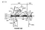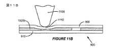 図11Bは、比較的よりフレキシブルな上側基板905と比較的あまりフレキシブルでない下側基板910との間にはさまれた低弾性率圧縮性層1025bを示している。この例では、スタイラスの力による上側基板905のたわまされたエリア1110は、スタイラス先端1105が上側基板905の外表面に対して押圧されるにつれて圧縮および変形する圧縮性層1025bの能力により、より大きい。図11Cに示す例では、スタイラス1105は、フレキシブル上側基板905が下側基板910との物理的接触を行う(または、ほぼ行う)のに十分に強く押圧されている。  FIG. 11B shows a low modulus