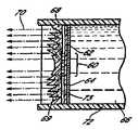 再び図1、およびバレル部分16の遠位端すなわち放射端17に位置するアレイ32を利用する本発明の実施形態を参照すると、ヒートチューブ38の反対側の端部、すなわち近位端が、熱交換器26に熱的に係合され、熱交換器は次いでファン28によって対流により冷却される。ヒートチューブ38にはんだ付けすることができる熱交換器は、図示されるようにフィンを有し、フィンに空気が向けられる。したがって、アレイ32は、ヒートチューブ38および内部の液体によって伝導により冷却され、次いでヒートチューブが、ファンなどによって、空気によって反対側の端部で対流により冷却される。  Referring again to FIG. 1 and an embodiment of the present invention that utilizes an array 32 located at the distal or radiating end 17 of the