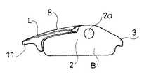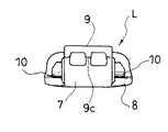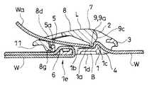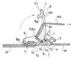 レバー体Lは、かかるベースBに起伏動可能に組み合わされるようになっている。このレバー体Lは、ベースBへの組み合わせ部7から延び出す操作部8と、この操作部8の延び出し方向と異なる向きにこの組み合わせ部7から突き出す挟持部9とを備えている。レバー体Lの所定の伏倒位置において、この挟持部9とベースBの基部1との間で帯状体Wの前記挟持がなされるようになっている。  The lever body L is combined with the base B so as to be movable up and down. The lever body L includes an