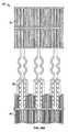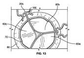 図12a−cは、弁尖及び補助構成要素組立体に対する3つの実施例を示す。かかる図の各々は、ステント上の交連ポスト20の上面図である。(交連ポストは、かかる図の各々において大きな矩形である。)図12a及び12cにおいて、交連ポストは一式の開口22を1つ備える。図12bにおいて、交連ポストは、2つの一式の開口22a及び22bを備える。図12a及び12bにおいて、バッファ層70は、ポストのID表面(かかる図に示される通り上方表面である)上においてのみある。図12cにおいて、バッファ層70は、ポストの全周囲に巻き付けられる。線60a及び60bは、夫々弁尖を示し、上端部における矢印は、弁尖材料が弁の中心軸に向かって図に見られるものを越えて継続する、ことを示している。破線90は、アイレット22及び弁尖60を通過する縫合を示す。留意すべき主要な特徴は、以下の通りである:  (1)ステント10と弁尖60との間におけるバッファ層70は、摩滅を低減する。  (2)弁尖60は、ポストの間隙を最小限にするよう共に縫合される。  (3)縫合結び目は、弁尖の運動/摩耗に干渉しないようポストのOD上にある。  (4)弁尖の自由端部62は、追加的なバッファ層を与えるよう(例えば弁の中心に向かって)巻き戻される(curled  back)。図12cにおいて弁尖は、弁が折り畳まれるときにステントセル間において十分な空間がある場合、(参照符号62において)IDからODまでポストの周囲にのみ巻き付けられ得る、ことが留意される。  Figures 12a-c show three examples for leaflets and auxiliary component assemblies. Each such view is a top view of the commissure posts 20 on the stent. (The commissure post is a large rectangle in each of these figures.) In FIGS. 12a and 12c, the commissure post includes one set of