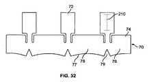 図32は、図6に示される特徴に対して加えられ得る特徴を有するバッファ層の設計を示す。矩形のフラップ72は、ステントポスト20のIDを縁取る。「I」字形状のスリット210は、材料70を通って切断され、結果もたらされるフラップは、IDからODまでステントポスト20の中央部24を通って巻き付けられ、続いて適所において固定される。  FIG. 32 shows a buffer layer design having features that can be added to the features shown in FIG. A