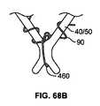 上述に加えて、本発明は、ステントセル端部に対してカフ80をしっかりと固定することにおいて起こり得る困難に対処し得る。例えば、特にはステント部40が参照符号50に示される通り広げられるとき、近接するカフ材料80は、弁尖60がカフ材料に対して固定されて荷重を受けるとき、ステントに沿って垂直方向に滑る傾向を有し得る。図65中の参照符号440は、このことが問題となり得る代表的な場所を示している。かかる場所440においてアイレット91を縫合が通ることは、材料が滑ることを防ぐ支援をし得る。図66−68はまた、カフ80をステントに対してよりしっかりと固定する支援をするためにステントセルの上部及び/又は下部において与えられ得る複数の他の形状を示す。例えば、図66は、代表的なステントセル40/50の端部における拡大された節状部(knob)450を与えることを示す。節状部450は、小さなネック領域452によってステントセルに対して接続される。縫合材料90は、図66に示される通りネック452の周囲に巻き付けられ得、縫合90によってステントに対して固定される他の材料が図示されるステントセル端部から離れて(本例においては)上方向に動くことを防ぐ支援をする。As shown in FIG. 65, the