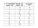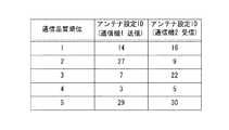 ここで、通信品質に適当な閾値を設け、その閾値を下回るアンテナ設定対についてはリストから除外するとよい。図10において通信品質順位が6位以降のアンテナ設定対が閾値を下回る場合、アンテナ設定対リストは図11のようになる。あるいは、アンテナ設定対リストに備蓄する設定対の数を予め決めておき、備蓄上限数を超えた通信品質順位の設定対をリストから除外するようにしてもよい。あるいは、通信品質閾値と備蓄上限数の両方を決めておき、通信品質閾値を上回るアンテナ設定対の数が備蓄上限数を超えた場合に、備蓄上限数以降の設定対を除外するようにしてもよい。勿論、場合によっては、アンテナ設定対の除外を行わず、図10そのものをアンテナ設定対リストとしてもよい。これらの処理は、処理・演算回路406、506で行えばよい。作成したアンテナ設定対リストは、記憶回路408、508へ格納すればよい。  Here, an appropriate threshold value is set for the communication quality, and antenna setting pairs below the threshold value may be excluded from the list. In FIG. 10, when the antenna setting pair whose communication quality rank is 6th or lower falls below the threshold value, the antenna setting pair list is as shown in FIG. Alternatively, the number of setting pairs to be stored in the antenna setting pair list may be determined in advance, and setting pairs having communication quality ranks exceeding the upper limit number of storage may be excluded from the list. Alternatively, both the communication quality threshold value and the stockpiling upper limit number are determined, and when the number of antenna setting pairs exceeding the communication quality threshold value exceeds the stockpiling upper limit number, the setting pairs after the stockpiling upper limit number are excluded. Good. Of course, in some cases, the antenna setting pair is not excluded, and FIG. 10 itself may be used as the antenna setting pair list. These processes may be performed by the processing /
