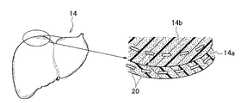 具体的には、図4に示すように、肝臓モデル14を、内臓器本体14bと、内臓器本体14bを被覆する外皮14aとの2層構造で構成し、外皮14a及び内臓器本体14bの各々に微細センサ20を配設する。配線で接続された複数の微細センサ20によるセンサ列を複数配列してセンサ群を構成し、センサ群を外皮14a及び内臓器本体14bの各々に配設することで、微細センサ20を3次元的に配設する。外皮14a及び内臓器本体14bの材質は、シリコンやゴム等とすることがでる。肝臓モデル14への微細モデル20の配設方法は、配線で接続されたセンサ群を外皮14a表面及び内臓器本体14bの枠組み内に吊るした状態でシリコンやゴムを注入して固定する。  Specifically, as shown in FIG. 4, the