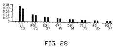 図28の棒グラフは、ダブルデルタ多角形二次(巻線)及びデルタ一次(巻線)変換を有する六相RCSIシステムによって出力された電流の高調波成分の相対的な大きさの分布を表す。電流高調波は、式(2)から計算することができ、六相RCSIシステムに対して定義する場合、φは6と等しく、nが整数列11、13、23、25、…、95及び97と等しい。六相RCSIシステムのTHD値は、式(4)から、15パーセントよりも小さいことが計算できる。  The bar graph of FIG. 28 represents the relative magnitude distribution of the harmonic components of the current output by a six-phase RCSI system with double delta polygon secondary (winding) and delta primary (winding) transformations. Current harmonics can be calculated from equation (2), and when defined for a six-phase RCSI system, φ is equal to 6, and n is an