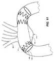 一実施形態では、管状本体部分102は、該管状本体部分に取り付けられるグラフト材料116を含み、それによって、少なくとも本体部分102は、流体に対して実質的に不透過性であり、かつ一方向の液体流路を作成する。グラフト材料116は、薄肉であり、よって小径に圧縮され得るが、それでも、分岐プロテーゼ100が円筒管状の形態に拡張された時に、分岐プロテーゼ100は、強力で漏れ耐性のある流体管路として作用することが可能であり得る。一実施形態(図15に記載の実施形態を参照)では、グラフト材料116は、PTFE(ポリテトラフルオロエチレン)、ePTFE、ポリウレタンポリマー、シロキサンポリマー、ポリカーボネートウレタン、シリコーン、または別の好適なポリマーの被覆物である。例えば、当業者によって理解されるように、管状本体102は、エラストマー含浸、エラストマー膜の積層、ePTFE/PTFE膜の積層によって、不透過性にしてもよい。管状本体102のための例示的な被覆物は、Noltingへの米国特許第6488701号明細書に開示されており、参照することによりその全体が本明細書に組み込まれる。グラフト材料116は、代替的に、管状本体102に取り付けられる、ポリエステルまたはDacronファブリック等の、低多孔性織布であってもよい。  In one embodiment, the