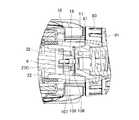 一方、第1ギヤケース9の規制溝37を除く前端内周面には、図4にも示すように、前端から軸方向の保持溝105,105・・が、周方向へ所定間隔をおいて形成されて、各保持溝105にラバーピン106が保持されている。このラバーピン106は、その内側に位置する結合リング34の外周面とインターナルギヤ23Cの外周面とに跨って当接して、第1ギヤケース9と結合リング34及びインターナルギヤ23Cとの間で圧縮されている。これによりインターナルギヤ23Cには、ラバーピン106によって回転方向への抵抗が常に加わることになる。  On the other hand, on the inner peripheral surface of the front end excluding the