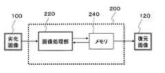 図3は、本発明の第1の実施形態における画像処理装置200の概略構成を示す図である。本実施形態の画像処理装置200は、入力された劣化画像100から復元処理を繰り返すことによって理想画像に近い復元画像120を生成する。画像処理装置200は、入力された劣化画像100に基づいて信号処理を行う画像処理部220と、処理の過程で生成される各種のデータが格納されるメモリ240を備えている。(Embodiment 1)
