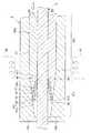 ところで、カテーテルは、その先端部に埋設された造影マーカ(例えば、特許文献1、2および3参照)を有しているため、操作者(医師)がX線造影下で当該カテーテルの先端部を狭窄部またはその近傍に位置させるのが容易となる。特許文献1に記載の造影マーカは、円筒状または楕円筒状をなす部材で構成され、その壁部にスリットが形成されたものである。特許文献2に記載の造影マーカは、円筒状をなす部材で構成され、その途中に径方向外側に突出したリング状の突出部(フレア)が形成されたものである。特許文献3に記載の造影マーカは、円筒状をなす部材で構成され、その外周部の両端部がそれぞれテーパ状をなすものである。  By the way, since the catheter has a contrast marker (for example, refer to