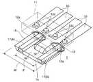 複数本(本例では2本)のコア部17(A,B)は、第1基板1の表面の略台形状の第1溝1a内に平行に配置されている。第1溝1aは、複数本のコア部17(A,B)を一定のピッチPで配置できる横幅Wに形成されている。  A plurality (two in this example) of core portions 17 (A, B) are arranged in parallel in a substantially trapezoidal