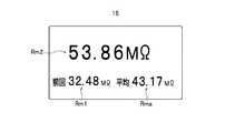 この時点で、上記した端子202aと筐体203との間の絶縁抵抗の測定値Rm(第1測定値Rm1)が既に記憶部15に記憶されているため、制御部13は、表示処理50のステップ53において、記憶部15に測定値Rmが既に記憶されていると判別し、続いて、平均値Rmaを算出する(ステップ57)。この場合、制御部13は、記憶部15から第1測定値Rm1(この例では、32.48MΩ)を読み出して、一例として、その第1測定値Rm1と、測定部12によって新たに測定された第2測定値Rm2(例えば、53.86MΩ)とを単純平均して平均値Rma(この例では、43.17MΩ)を算出する。  At this time, since the measured value Rm (first measured value Rm1) of the insulation resistance between the terminal 202a and the