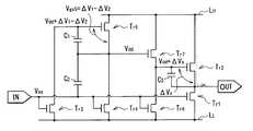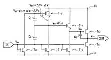 ところで、例えば、図33に示したような従来のインバータ回路200は、2つのnチャネルMOS型のトランジスタTr1,Tr2が直列接続された単チャネル型の回路構成となっている。インバータ回路200では、例えば、図34に示したように、入力電圧VinがVssとなっている時、出力電圧VoutがVddとはならず、Vdd−Vth2となってしまう。つまり、出力電圧Voutには、トランジスタTr2の閾値電圧Vth2が含まれており、出力電圧Voutは、トランジスタTr2の閾値電圧Vth2のばらつきの影響を大きく受けてしまう。[effect]