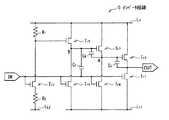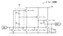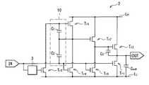 トランジスタTr3は、入力電圧Vinと低電圧線LLの電圧VLとの電位差Vgs3(またはそれに対応する電位差)に応じてトランジスタTr5のゲートと低電圧線LLとの電気的な接続を継断するようになっている。トランジスタTr3のゲートが入力端子INに電気的に接続されている。トランジスタTr3のソースまたはドレインが低電圧線LLに電気的に接続されており、トランジスタTr3のソースおよびドレインのうち低電圧線LLに未接続の端子がトランジスタTr5のゲートに電気的に接続されている。トランジスタTr4は、入力電圧Vinと低電圧線LLの電圧VLとの電位差Vgs4(またはそれに対応する電位差)に応じてトランジスタTr5のソースおよびドレインのうち高電圧線LHに未接続の端子(端子B)と低電圧線LLとの電気的な接続を継断するようになっている。トランジスタTr4のゲートが入力端子INに電気的に接続されている。トランジスタTr4のソースまたはドレインが低電圧線LLに電気的に接続されており、トランジスタTr4のソースおよびドレインのうち低電圧線LLに未接続の端子がトランジスタTr5の端子Bに電気的に接続されている。トランジスタTr5は、容量素子C1の端子間電圧Vgs5(またはそれに対応する電位差)に応じて高電圧線LHと端子Bとの電気的な接続を継断するようになっている。トランジスタTr5のゲートがトランジスタTr3のソースおよびドレインのうち低電圧線LLに未接続の端子に電気的に接続されている。トランジスタTr5のソースまたはドレインが高電圧線LHに電気的に接続されている。トランジスタTr5のソースおよびドレインのうち高電圧線LHに未接続の端子(端子B)がトランジスタTr7のゲートと、トランジスタTr4のソースおよびドレインのうち低電圧線LLに未接続の端子とに接続されている。Transistor Tr3 is electrical the input voltage Vin the gate and the low-voltage line LL of the transistor Tr5 according to the potential difference Vgs3 the voltage VL of the low-voltage line LL (or the corresponding potential difference thereto) The connection is broken. The gate of the transistor Tr3 is electrically connected to the input terminal IN. The source or drain of the transistor Tr3 is electrically connected to the low-voltage line LL, the electrical terminal unconnected of the source and the drain of the transistor Tr3 to the low-voltage line LL is the gate of the transistor Tr5 It is connected to the. Transistor Tr4 is not yet in the high-voltage line LH of the source and the drain of the transistor Tr5 according to the potential difference VGS4 (or potential difference corresponding thereto) with the voltage VL of the input voltage Vin and the low-voltage line LL The electrical connection between the connection terminal (terminal B) and the low voltage line LL is interrupted. The gate of the transistor Tr4 is electrically connected to the input terminal IN. The source or drain of the transistor Tr4 is electrically connected to the low-voltage line LL, terminals unconnected of the source and the drain of the transistor Tr4 to the low-voltage line LL electrical terminal B of the transistor Tr5 Connected. The transistor Tr5cuts off the electrical connection between the high voltage line LH and the terminal B according to the inter-terminal voltage Vgs5 (or potential difference corresponding thereto) of the capacitive element C1 . The gate of the transistor Tr5 is electrically connected to a terminal not connected to the low voltage line LL among the source and drain of the transistor Tr3 . The source or drain of the transistor Tr5 is electrically connected to the high voltage line LH. A terminal (terminal B) that is not connected to the high voltage line LH among the source and drain of the transistor Tr5 is a terminal that is not connected to the low voltage line LL between the gate of the transistor Tr7 and the source and drain of the transistor Tr4. And connected to.
