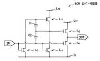 ところで、インバータ回路1は、図35に示した参考例に係るインバータ回路600との関係では、出力段のトランジスタTr1,Tr2と、中段のトランジスタTr4,Tr5との間に、トランジスタTr6,Tr7と、容量素子C3とを挿入したものに相当する。このように、インバータ回路600において、トランジスタTr6,Tr7と、容量素子C3とを挿入することにより、後に詳述するように、トランジスタTr2,Tr5,Tr7のドレインに接続した電圧線を共通化することが可能となる。Incidentally, in the relationship with the inverter circuit 600 according to the reference example shown in FIG. 35, the inverter circuit 1 includes a transistor Tr between the output stage transistors Tr1 and Tr2 and the intermediate stage transistors Tr4 and Tr5.6 , Tr7 and a capacitor element C3 are inserted. As described above, by inserting the transistors Tr6 and Tr7 and the capacitor C3 in the inverter circuit 600, the voltage connected to the drains of the transistors Tr2 , Tr5 , and Tr7 as will be described in detail later. It is possible to share lines.