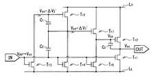 C2(Vdd−Vss)/(C1+C2)>Vth5…(1)The capacitive elements C1 and C2 are inserted in series between the input terminal IN and the gate of the transistor Tr5 . An electrical connection point D between the capacitive element C1 and the capacitive element C2 is electrically connected to a terminal B of the transistor Tr5 . The capacitive element C1 is inserted on the gate side of the transistor Tr5 , and the capacitive element C2 is inserted on the gate side of the transistor Tr1 . The capacitance of the capacitive element C2 is larger than the capacitance of the capacitive element C1 . The capacitances of the capacitive elements C1 and C2 preferably satisfy the following formula (1). If meeting the capacitive element C1, C2 is the number 1, when the fall of the input voltage Vin to be described later, the gate of the transistor Tr5 - can be the source voltage and the threshold voltage Vth5 above, transistor Tr5 can be turned on. As a result, the output voltage Vout can change from low to high.