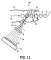 ミラー構成201は、各々のステージ201a、201bにおける2つのミラー面21、22を特徴とする。ここでは、ミラー面21、22は平面であり、互いに漏斗状であり、ある角度で近接している。プリフォームOは、搬送方向OTにおける製造ラインPに沿ってそれらのミラー面21、22間を移動する。図2は、そのミラー構成の断面図である。ここではブロックとして簡単に示されている搬送システム11は、フックを有するコンベアベルト11であり、プリフォームOはそのフックに掛けられ、図2の紙面に対して垂直方向に平坦であるミラー面21、22間の空間を通って移動する。それらのミラー面21、22は、光を最適に反射するように、内側の面において高い反射性を有する何れかの適切な材料から成る。 The