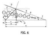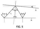 この効果については、図5及び6を参照して、下で説明する。明確化のために、単独の光ビームLが、ミラー面21、22間を行ったり来たりしながら反射されるように示されている。その光ビームLは線で示されている。それらの図においては、簡単化のために、下方のミラー面22はその光ビームに関する基準面とみなされ、その光ビームに関して角度が演算される。製造ラインPに沿った基準面に関して、演算が同様に適切に実行されることが可能である。その場合、2つのミラー面21、22は、基準面に対してある角度にあり、その角度はその演算を複雑にする。 This effect is described below with reference to FIGS. For clarity, a single light beam L is shown reflected back and forth between mirror surfaces 21 and 22. The light beam L is indicated by a line. In these figures, for the sake of simplicity, the