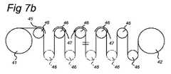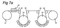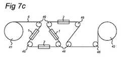 図7cに、さらに別の代替構成が概略的に示されている。巻戻しローラ41と巻取りローラ42の間に、いくつかのテンションローラ46が設けられる。2つのテンションローラ46の間に第1処理空間1又は第2処理空間2が、本発明のステップBとステップCを交互に適用するように設けられる。 In FIG. 7c, yet another alternative configuration is schematically shown.