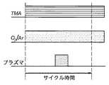 満足な単分子層堆積法を得るには、ガス流を制御する方法を有することが重要である。一実施形態では、前駆体を含むガス混合物が処理空間5に付加され反応が完了した後、処理空間は不活性ガス(混合物)でフラッシングされる。この後、活性ガスを含む不活性ガス(混合物)が、基板6から離れたプラズマ発生器10の電極3の間に挿入され、プラズマの点火後に、例えばガス混合物を処理空間5に吹き付ける、又はパージすることによって基板6に供給される。基板6は、ある線形速度で処理空間5中を移動させることができる。この処理の後、処理空間5は再び不活性ガス(混合物)でフラッシングされ、ステップB及びCは、所望の数の単分子層が得られるまで繰り返すことができる。この方法では、前駆体材料はガス(混合物)中にパルス的に供給され、反応剤は、不活性ガス又は不活性ガス混合物とともにガス混合物中にやはりパルス的に導入され、この方法はさらに、前駆体材料の各パルス的供給、及び反応剤のパルス的導入の後に、過剰な材料及び反応生成物を不活性ガス又は不活性ガス混合物を用いて除去することも含む。これは、一実施形態として図2に概略的に示されており、この場合、TMAは前駆体として、アルゴンはフラッシングガスとして、酸素は反応剤として使用されている。 In order to obtain a satisfactory monolayer deposition method, it is important to have a method for controlling the gas flow. In one embodiment, after the gas mixture containing the precursor is added to the processing space 5 and the reaction is complete, the processing space is flushed with an inert gas (mixture). Thereafter, an inert gas (mixture) containing an active gas is inserted between the