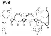 図6に、基板6が無限ウェブ基板の形で供給される別の装置実施形態が概略的に示されている。この装置は、2つの主駆動シリンダ31、32を含み、これらはテンションローラ33、並びに処理ローラ34及び35を介して基板6を駆動する。処理ローラ34は、本発明のステップBを実施する第1処理空間1に沿って基板6を駆動し、処理ローラ35は、本発明のステップCを実施する第2処理空間2に沿って基板6を駆動する。この実施形態で、第2処理空間2もやはり、基板6を損傷しないように、付随するプラズマ発生器10から離れている。 FIG. 6 schematically shows another apparatus embodiment in which the