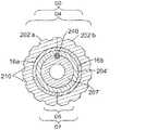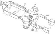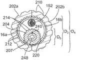 ノブ202をギア204と回転連結させるために、例えば、ノブからギアへの回転動作を係合させ、かつ付与させることで、ノブ202の内表面及びギア204の外表面は、連動歯212及び214等の形成体を有する(図24)。図示した実施形態では、ギア204の外径D5は、ギア204の回転軸がノブ202の回転軸及び制御ハンドルの縦方向軸から軸外になるように、ハンドル16の横断面の直径D1並びに制御ノブ202の直径D3及びD4よりも、例えば、50%又はそれ以上に、有意に小さい。したがって、歯212及び214の一部分のみが常に互いに係合する。  In order to rotationally couple the
