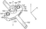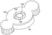 ロッカー部材78は、長さLの寸法、幅Wの寸法及び厚さTの寸法を有する(図10及び11)。その厚さ寸法Tとともに、ロッカー部材78は、全体の厚さを貫通して延在する中心孔又は通路143を画定する、2つの対向する環状形成物140a及び140bで構成される。中心孔143は、偏向アーム75の回転軸76と合致する。その長さに沿って、ロッカー部材78は、中央孔143を挟んで互いに対立する2つのより小さい孔146も有する。それぞれの孔には、滑車147、例えば、軸76に平行な回転軸を有するスナップベアリング(図12)が位置している。それぞれの偏向牽引部材42は、スロット148を通ってロッカー部材に進入し、一部分は、それぞれの滑車147に巻きつけられている。  The