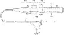 図1を参照すると、制御ハンドル16は、好適な鋳造処理により構成されたプラスチック等の任意の好適な剛性材料で作製することが可能な、概ね細長いハンドルハウジングを備える。図示された実施形態では、ハウジングは、2つの対向する半分体16a及び16bを含み、これらは、概ね互いに鏡像関係にあり、糊、超音波接合又は他の適切な手段により、ハウジングの周囲の長手方向の継ぎ目28に沿って接合される。図示した実施形態では、反対の半分体によって形成されたハンドル16の横断面は、ハンドルの長さに沿って変化する。より遠位の部分112は、更に小さく、概ね長方形の横断面を有する。中央部分114は、更に大きく、概ね長方形の横断面を有する。より近位の部分116は、概ね円形の横断面を有する。  Referring to FIG. 1, the control handle 16 comprises a generally elongated handle housing that can be made of any suitable rigid material such as plastic constructed by a suitable casting process. In the illustrated embodiment, the housing includes two opposing