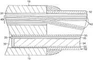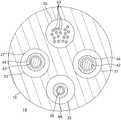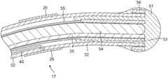 一連の環電極26は、図5に示すとおり、マッピングアセンブリ17の概ね円形の主要領域39の非導電性カバー52上に載置される。環電極26は、プラチナ若しくは金、又はプラチナ及びイリジウムの組み合わせ等のいかなる好適な固体導電性材料でも作製することが可能であり、糊等で非導電性カバー52の上に載置することが可能である。あるいは、環電極26は、非導電性カバー52をプラチナ、金及び/又はイリジウム等の導電性材料で被覆することによって形成することが可能である。コーティングは、スパッタリング、イオンビーム蒸着又は等価な技術を用いて施されることができる。好適なマッピングアセンブリは、米国特許第7274957号に説明され、その全体の開示は、参照することにより本明細書に組み込まれる。必要に応じて、更なる電極(図示せず)を、中間部分14及び/又は概ね線状の近位部分38に沿って載置することが可能である。  A series of