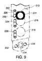 例示的な実施形態に係る例示的なバネ要素222、224、226は、システム100のバネ要素122の材料に実質的に類似した材料で形成された実質的に平面な要素として構成されている。バネ要素222、224および226はそれぞれ互いから分離されており、横方向の穴219、220のうちの1つの中に別々に永久的に挿入されるよう構成されている。バネ要素222、224、226は、(例えば、製造時の)摩擦嵌合によって、横方向の穴219、220のうちの1つの中の適所にそれぞれ保持されている。バネ要素222、224、226はそれぞれ、第1の部分228および第2の部分230を含み、システム100に関してより詳細に説明したように、第2の部分230は、それに圧力を加えると(例えば、保護スリーブ204の回転によって)、組み合わせ穴216または丸穴218の中心から離れて横方向に変形するように構成および寸法決めされている。また、上により詳細に説明したように、バネ要素222、224、226はそれぞれ、平坦部分140を形成する保護スリーブ内に形成された切抜きの深さに実質的に等しい長さだけ組み合わせ穴216および丸穴218の中に部分的に突出するように配置されている。この構成によって、保護スリーブ204が図8に示す構成で組み合わせ穴216の中に挿入されている場合にバネ要素を実質的に妨害されていない状態に維持することができる。保護スリーブ204を図9に示す位置に回転させると、半径方向の拡張力がバネ要素222に加えられ、それにより、第2の部分230が半径方向外側に変形する。  The