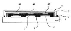 このとき封止材としては、水分や酸素の透過性が低い基材である必要がある。また、材料の一例として、アルミナ、窒化ケイ素、窒化ホウ素等のセラミックス、無アルカリガラス、アルカリガラス等のガラス、石英、アルミニウムやステンレスなどの金属箔、耐湿性フィルムなどを挙げることができる。耐湿性フィルムの例として、プラスチック基材の両面にSiOxをCVD法で形成したフィルムや、透過性の小さいフィルムと吸水性のあるフィルムまたは吸水剤を塗布した重合体フィルムなどがあり、耐湿性フィルムの水蒸気透過率は、10-6g/m2/day以下であることが好ましい。  At this time, the sealing material needs to be a base material having low moisture and oxygen permeability. Examples of the material include ceramics such as alumina, silicon nitride, and boron nitride, glass such as alkali-free glass and alkali glass, metal foil such as quartz, aluminum, and stainless steel, and moisture-resistant film. Examples of moisture-resistant films include films formed by CVD of SiOx on both sides of plastic substrates, films with low permeability and water-absorbing films, or polymer films coated with a water-absorbing agent. The water vapor transmission rate is preferably 10 −6 g /
